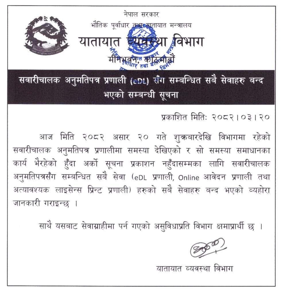 ‘सवारी चालक अनुमतिपत्रसँग सम्बन्धित सबै सेवा (ईडीएल प्रणाली, अनलाइन आवेदन प्रणाली तथा अत्यावश्यक लाइसेन्स प्रणाली)हरूको सबै सेवाहरू बन्द भएको व्‍यहोरा जानकारी गराइन्छ,’ विभागको विज्ञप्तिमा भनिएको छ। समस्या समाधान कार्य भइरहेको समेत विभागले जनाएको छ।
